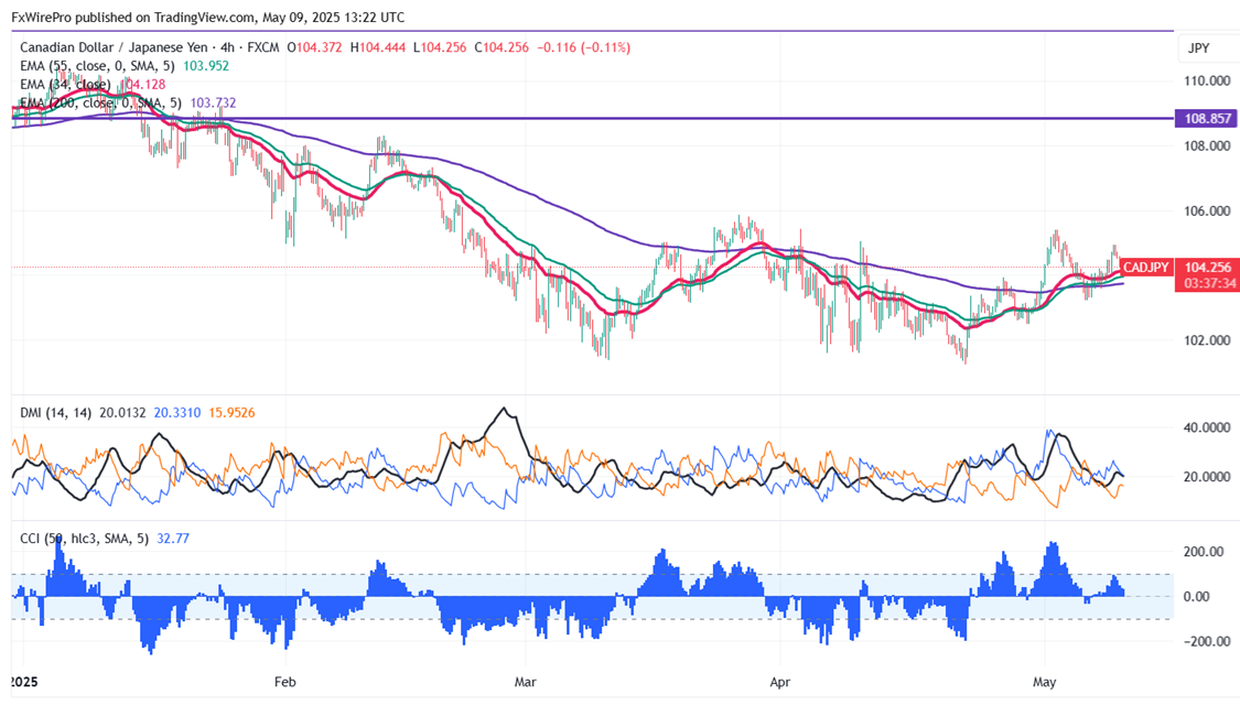 CAD/JPY is currently trading above the 34- and 55-EMA on the 4-hour chart. The immediate resistance is at 105; a breach above this level could shift targets to 105.51/106/107/108.25. On the lower side, near-term support is at 103.50 and a break below this support could lead to declines toward 103/102.50/10.65/101/100.