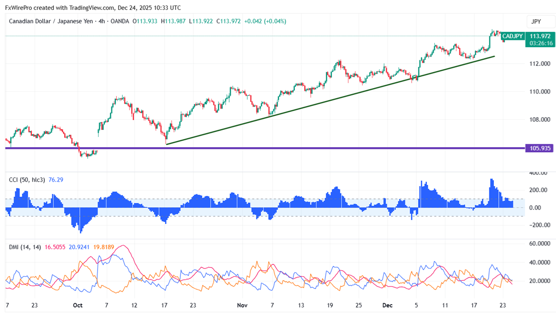 CAD/JPY trades flat with positive bias. It hit a high of 114.45 the previous week and is currently trading around 113.948.