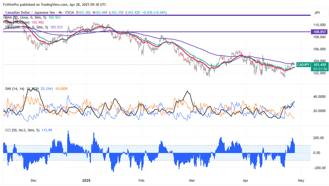 CAD/JPY is currently trading above the 34- and 55-EMA on the 4-hour chart. The immediate resistance is at 104; a breach above this level could shift targets to 105/106/106.85. On the lower side, near-term support is at 102.90 and a break below this support could lead to declines toward 102.50/10.65/101/100.