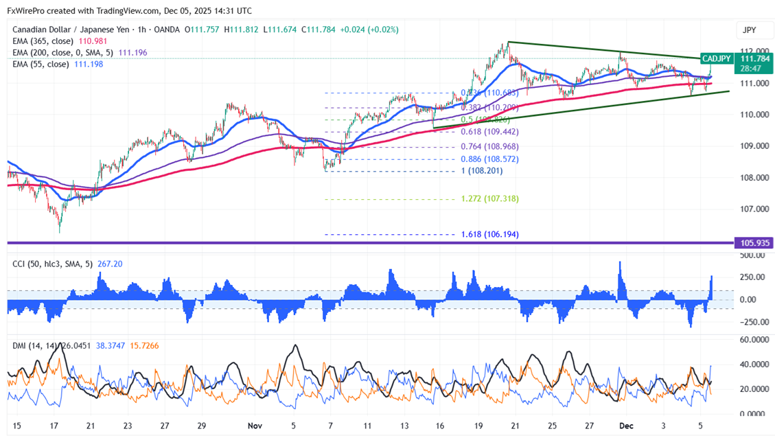 CAD/JPY is currently trading above the 34- and 55-EMA and above 200 EMA and 365 EMA on the 4-hour chart. The immediate resistance is at 112; a breach above that level could shift targets to 113/114/114.69. On the lower side, near-term support is at 111.20, and a break below this support could lead to declines toward 110.50/110/109.50/109.