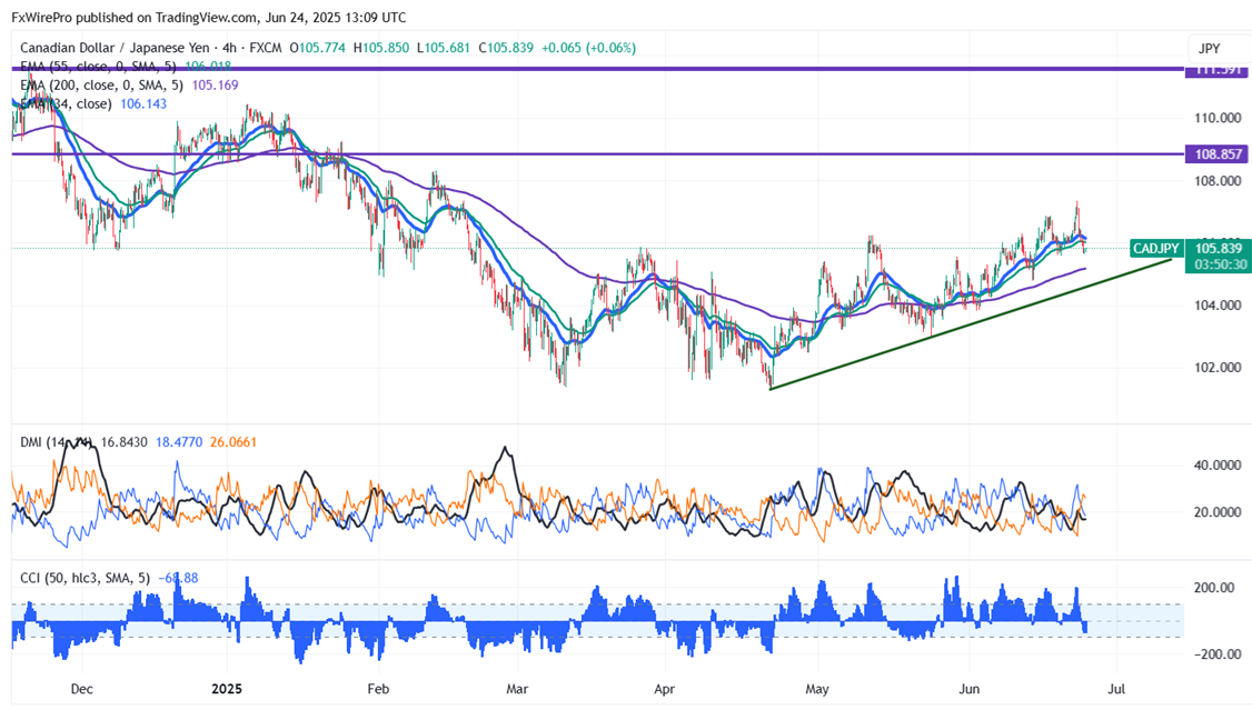 CAD/JPY is currently trading below the 34- and 55-EMA on the 4-hour chart. The immediate resistance is at 106.35; a breach above this level could shift targets to 107/108.25. On the lower side, near-term support is at 105.50,and a break below this support could lead to declines toward 104.78/104.50/103.85/103/102.50/10.65/101/100.