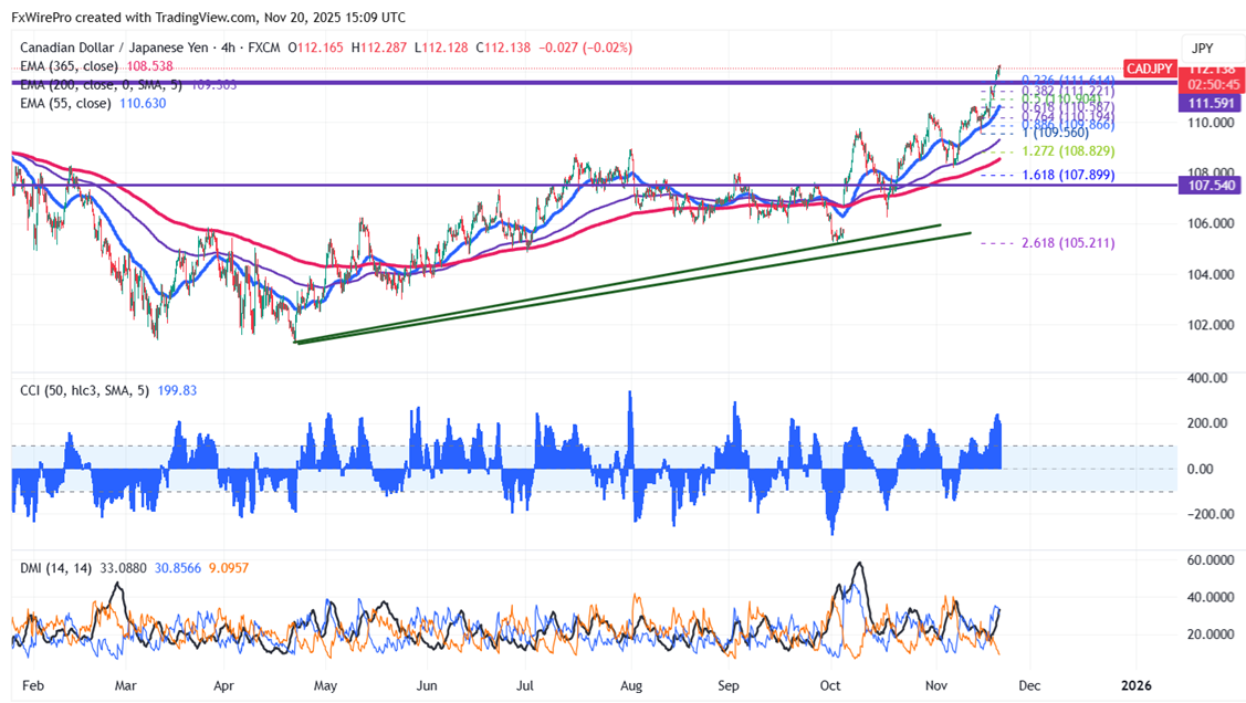 CAD/JPY trades above 112 on yen weakness. It hit a high of 112.28 at the time of writing and is currently trading around 112.18.