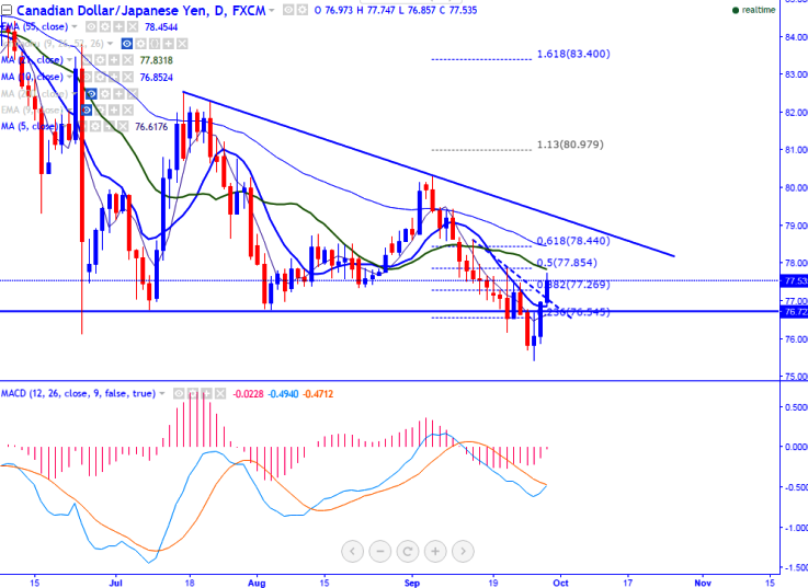 - CAD/JPY is trading well above 5- day (76.55) and 76.85 (10- day MA). So the trend is slightly bullish. But it is trading slightly below 21- day MA.