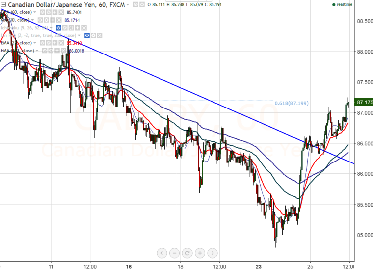 - The jump from 74.80 and 88.92 will come to end if it closes below 85 level. The pair short term support is at 86.27 (200- H MA) and any break below will drag the CAD/JPY till 85.68 (61.8% retracement of 84.80 and 87.10).