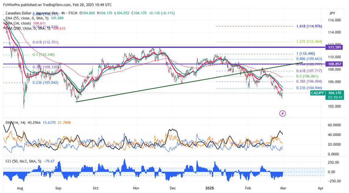 CAD/JPY lost its shine on the weak Canadian dollar. It hit a low of 103.18 and is currently trading around 104.11.