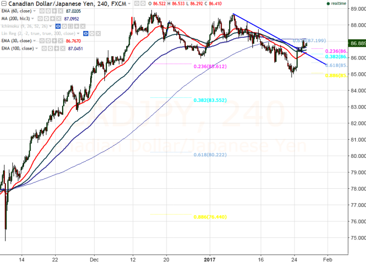 - The jump from 74.80 and 88.92 will come to end if it closes below 85 level. The pair short term support is at 86.27 (200- H MA) and any break below will drag the CAD/JPY till 85.68 (61.8% retracement of 84.80 and 87.10).