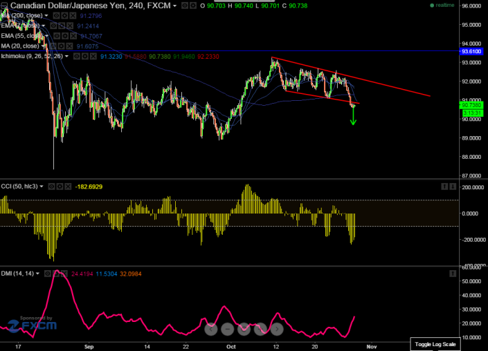 CAD/JPY has broken trend line support around 90.90 (trend line joining 91.47 and 91.11) and this confirms short term weakness , a decline till 89.71 is possible.