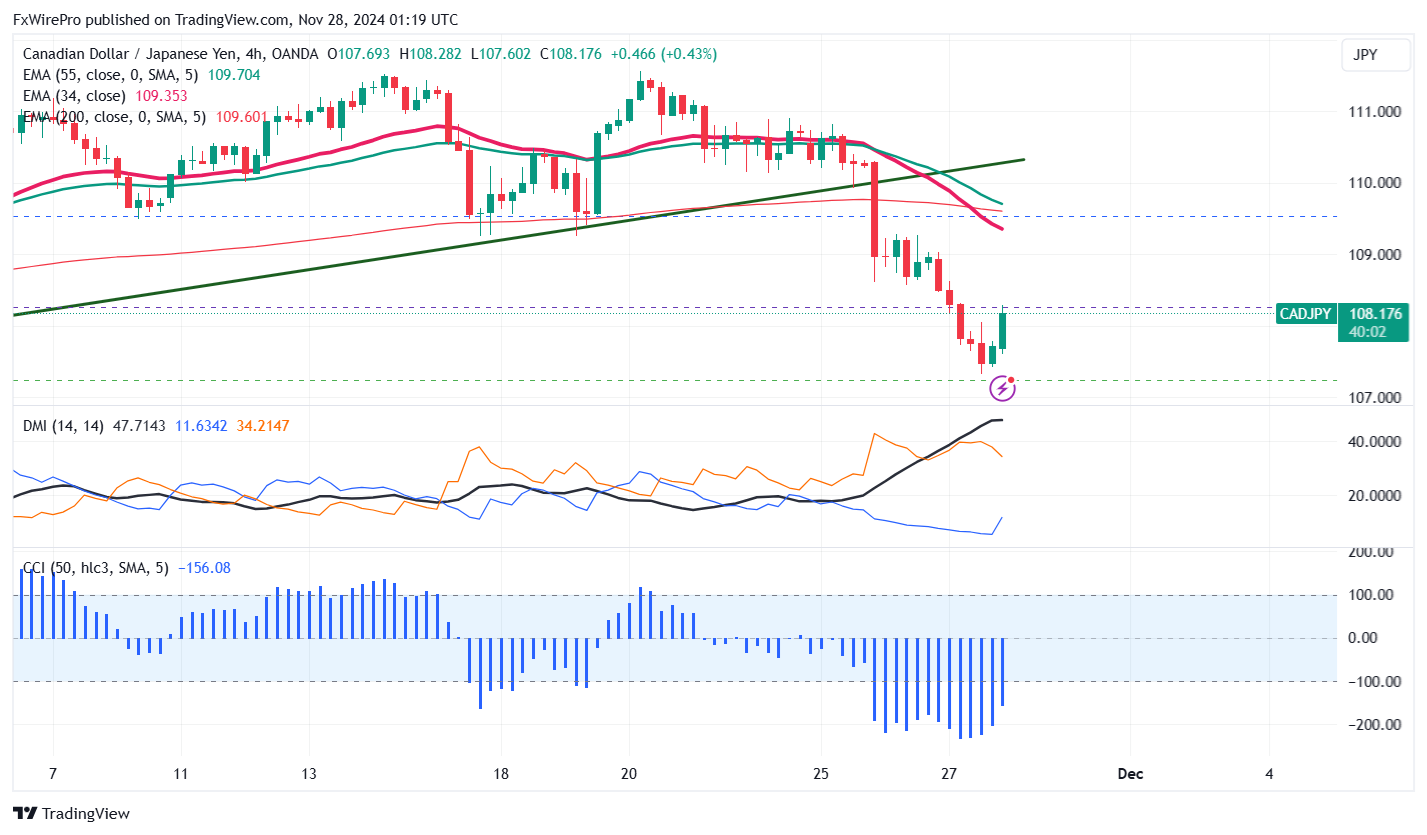 CADJPY has lost its shine as the Japanese yen strengthens, hitting an intraday low of 107.32, with current trading around 108.20.