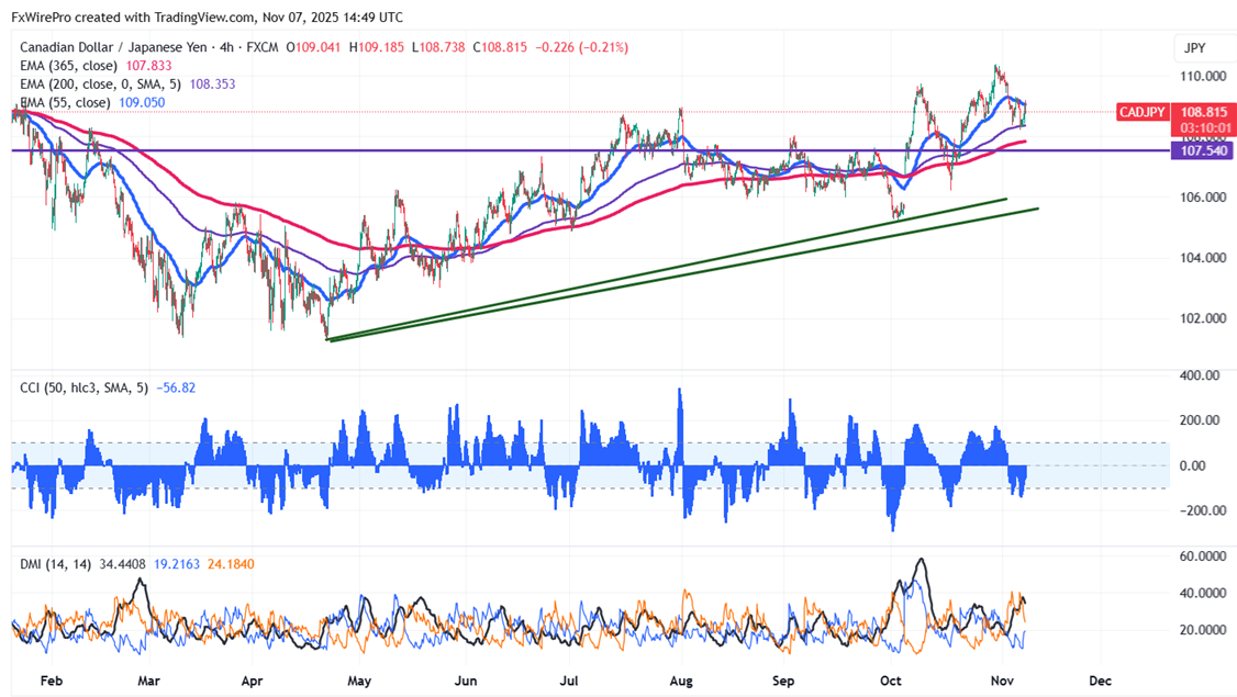 CAD/JPY is currently trading above the 34- and 55-EMA on the 4-hour chart. The immediate resistance is at 109.60; a breach above that level could shift targets to 110/110.50/111/111.52/112. On the lower side, near-term support is at 10,and a break below this support could lead to declines toward 108.80/108/107.