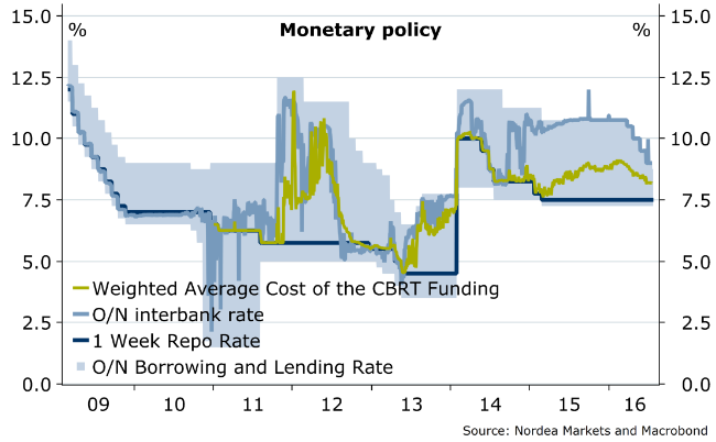 The Turkish central bank’s Monetary Policy Committee on Tuesday decided to lower the upper end of its overnight corridor – the overnight lending rate - by 25 basis points to 8.75 percent. This was CBRT’s fifth straight rate cut. It kept the repo rate unchanged at 7.5 percent.