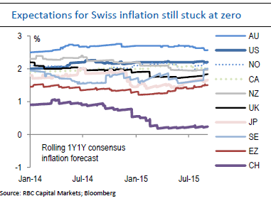 The above figure shows updated 1Y1Y consensus expectations (year ahead inflation, 12 months out). By 2016, Switzerland is expected to be the only G10 country with inflation still hugging zero.