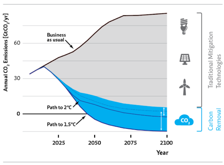 Limiting warming to 1.5°C or 2°C requires mitigation (energy efficiency and renewable generation) and CO₂ removal. MCC