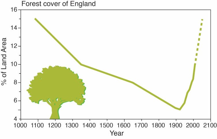 Forest cover in England has fallen sharply over the last 1,000 years. Fighting climate change presents an urgent opportunity for reforestation. DEFRA, Author provided