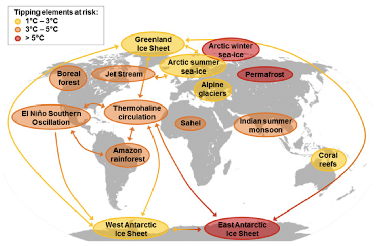 Global map of potential tipping cascades, with arrows showing potential interactions. Steffen et al/PNAS
