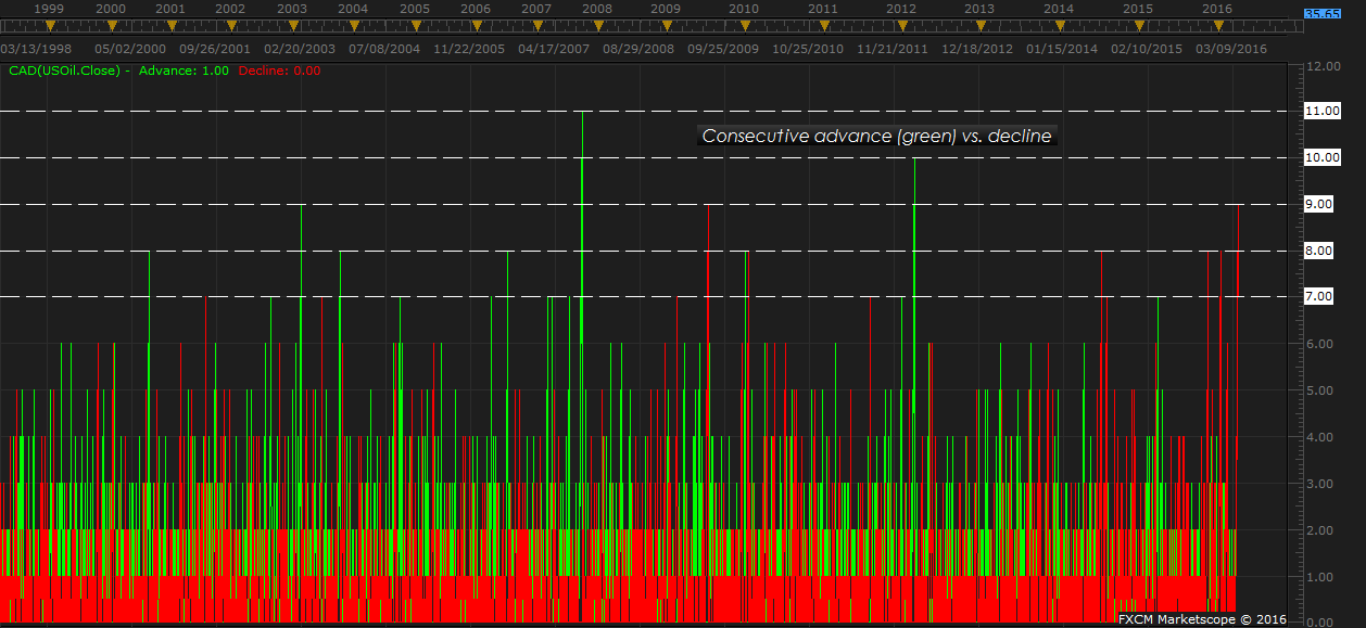 These long declines are however quite rare, suggesting with every day passing by in red, chances of a bounce back is rising. Since 1999, in past 17 years of trading there has been only two instances, when WTI has declined for 9 consecutive days including the current.