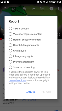 This last idea — of user complaints — depends on parents to be vigilant or to teach children to make these complaints themselves. But there is no prominent complaint option in YouTube’s interface. The option to report harmful content is hidden in a sub-menu with a flag as a rather subtle visual cue.