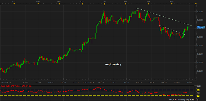 - Friday's CPI release disappointed to the downside, making loonie vulnerable to further stimulus from Bank of Canada (BOC). Though BOC is most likely to wait further data confirmation before taking any action. Core consumer prices rose 2.3% y/y in April and headline consumer prices rose 0.8% y/y. Headline CPI dropped by -0.1% in April on monthly basis.