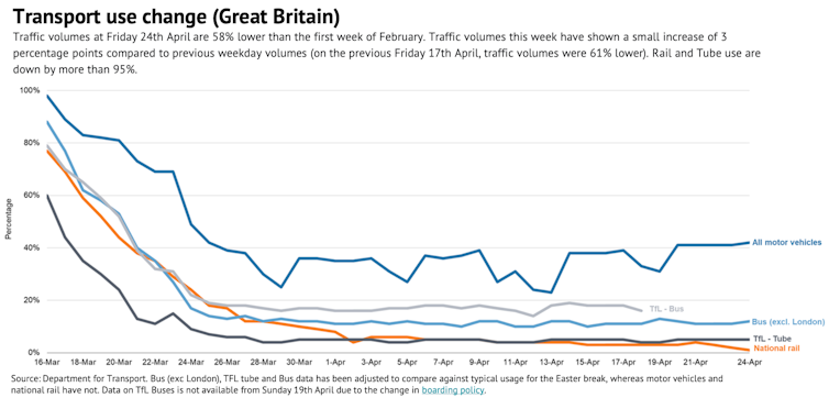 But car travel didn’t tumble as dramatically. In the UK, after a steep fall in the week of March 23, car trips have risen steadily and are now only 22% lower than they were before COVID-19, as those who do need to make journeys are disproportionately making them by car.