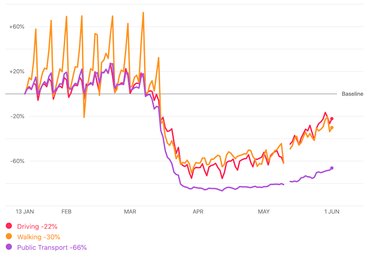 The number of journeys made by car, foot and public transport in the UK from January 13 to June 3 2020. Apple Maps