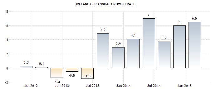 - Latest data revealed that Irish economy grew 1.4% in the first quarter 2015 on quarterly basis, while annual growth rate is now at 6.5%, close to China's GDP growth of 7%.