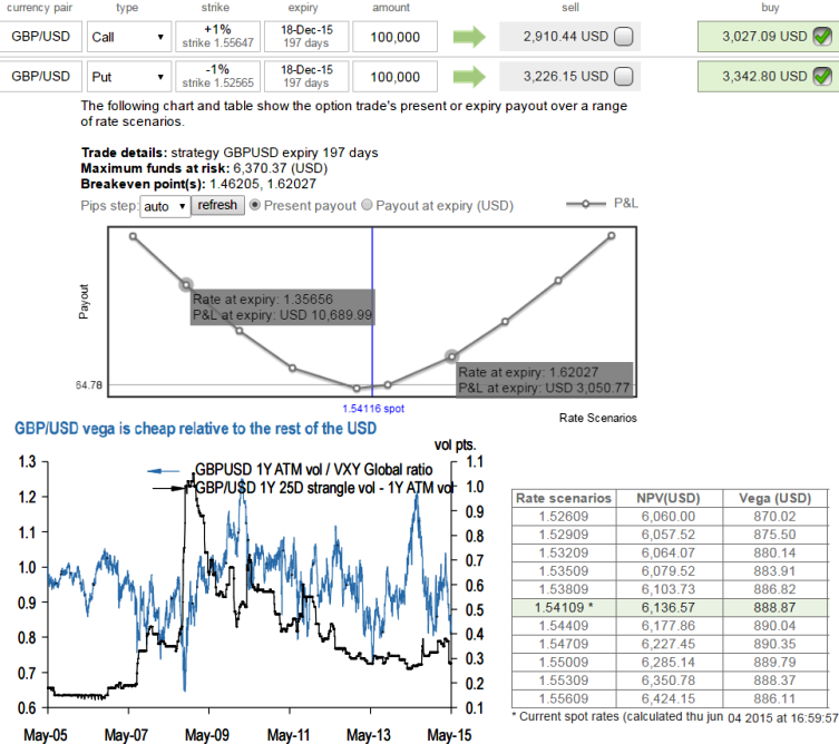 On a long term hedging perspective, Long Vega GBP/USD strangles is recommended.