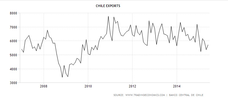 Chile's exports have dropped more than 25% after peaking in December 2010. In June exports were $5.72 billion compared to $7.76 billion in December, 2010.