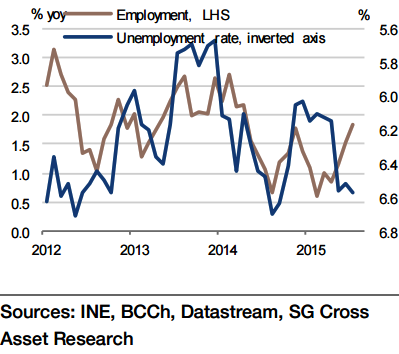 "On the growth front, it has helped consumption to stay afloat in a weak investment and growth environment. Nevertheless, with the economy's growth potential taking a significant hit from the commodity downturn, the unemployment rate is likely to be higher in the medium term, recent robustness notwithstanding", says Societe Generale.