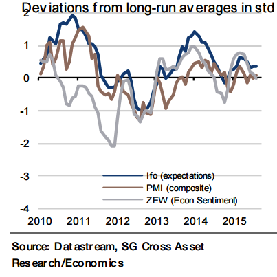 "In September, the ZEW investor economic sentiment indicator to have dropped to 14.3 from 25 before, affected negatively by the increased market turbulence surrounding the economic outlook in China. Also the assessment of current conditions is likely to have softened although remaining at a historically high level", says Societe Generale.