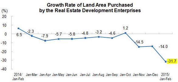 - Growth rate in land area purchase by developers in China, remained negative throughout 2014. Growth rate fell by -14%. In the first 2 months in 2015, the rate has fallen by staggering 31.7% YoY.