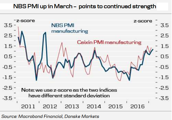"With continued strength in China, emerging markets assets and global risk sentiment continue to get support from this front. Some moderation in PMI in coming quarters should weaken the picture but not cause great turmoil," adds Danske Bank.
