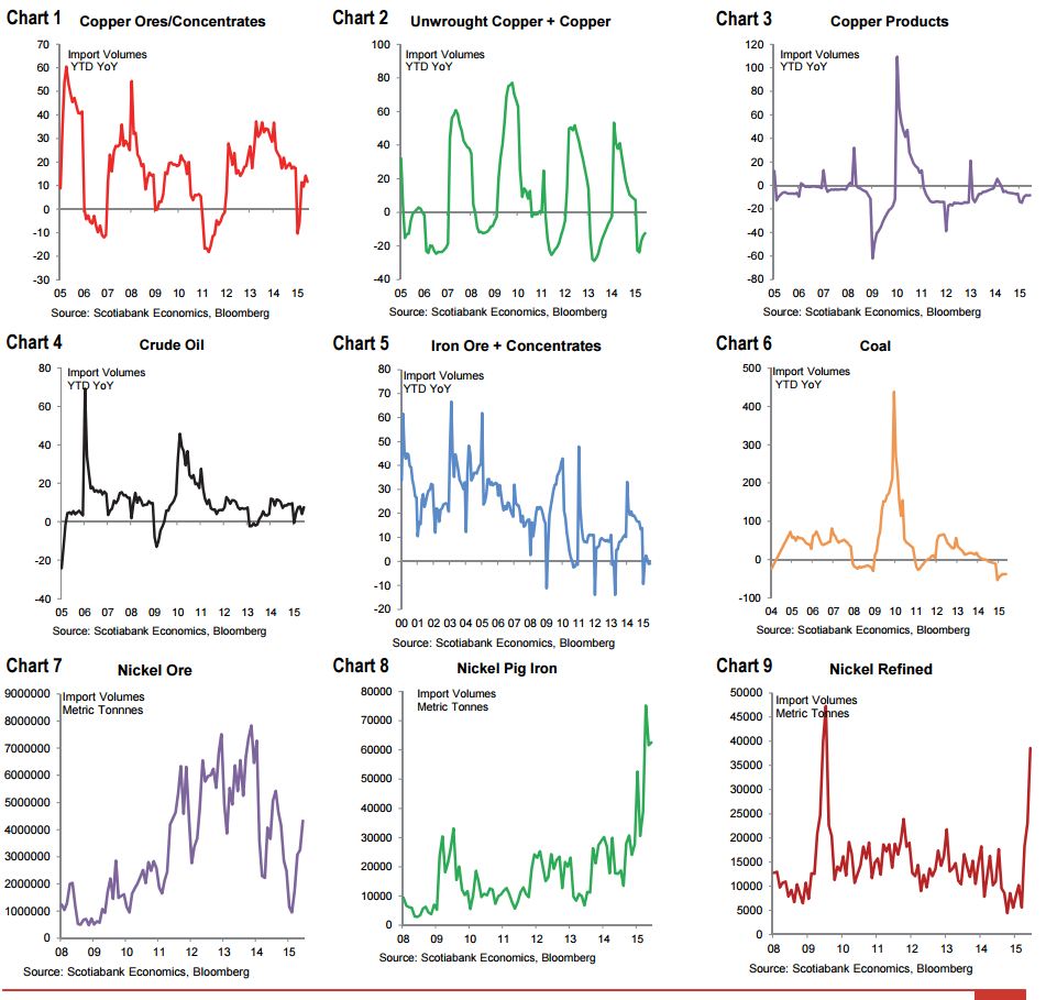 - Two is that China’s resource demands are heavily differentiated across other commodities. Crude oil, nickel and copper ores are growing solidly but copper products and unwrought copper plus coal are falling sharply.