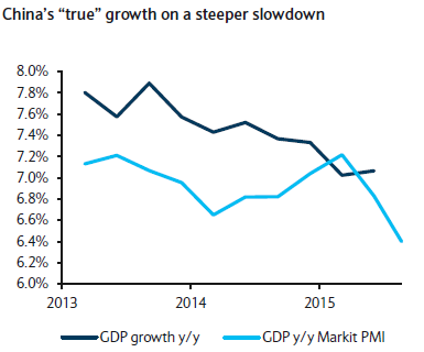 Despite the recent focus on the CNY, this negative growth backdrop likely has a much larger implication for the global economy and asset markets. While bearish, the growth outlook is not catastrophic, as healthy consumer spending and supportive infrastructure investment should partially offset the secular slowdown in private investment, particularly residential, says Barclays. However, the net effect is not only a slower economy but also increased risks of a hard landing.