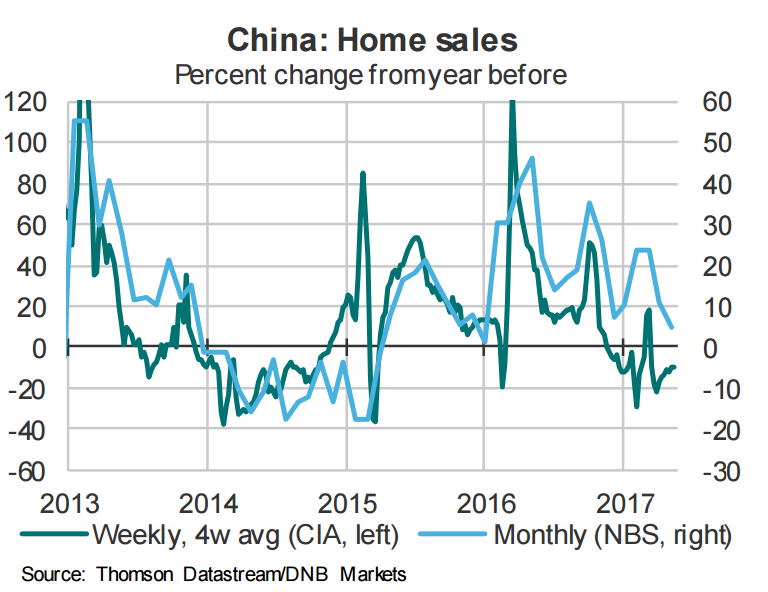 Tough regulations imposed by Chinese regulators with restrictions on home purchases to prevent speculation in the housing market have seems to be working. That said, regional divergences seem to be rising. Sales in north-western cities rose by around 25 percent y/y, while sales in southeastern cities are fell by around 25 percent y/y.
