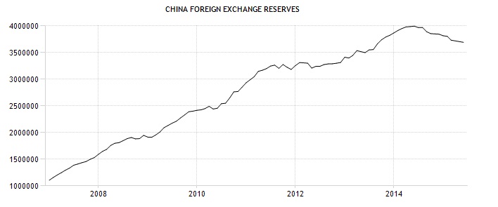 - China's forex reserve is down almost 7.5% from its peak in June 2014, which amounts to $ 300 billion. In June 2015, it declared its forex reserve at $3.69 trillion. These drops came in the back of high trade surplus, which means large sum of money is either going out of Capital account or PBOC is using heavy intervention to keep the Dollar/Yuan stable.