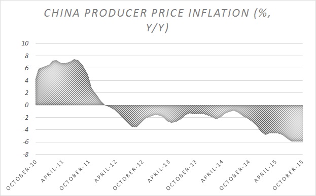 Wind of deflation seems just not ready to leave China. At one hand, China's producer price index failed to grow in November, while producer prices remained in deflation, just a quarter shy of four years. Producer price has been deflating at -5.9% y/y since August. This time economists were expecting it to worsen to -6%.