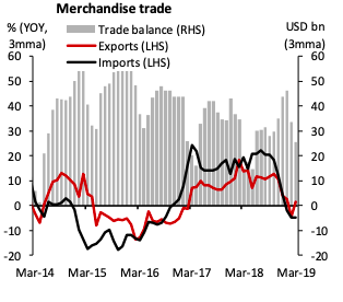 China’s export performance improved markedly. Growth rebounded to 14.2 percent y/y in March from -4.6 percent in January-February and led 1Q19 growth to 1.4 percent. An improvement in sentiment banking on hopes for an easing in trade tensions was also evident in other indicators.