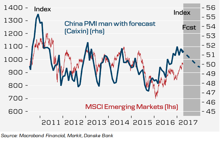 "We continue to look for a peak in Q1 and a moderate slowdown during 2017. As a result China will contribute to a peak in the global business cycle in H1 and provide less support to Emerging Markets and commodity markets. The underlying downward pressure on CNY persists," said Danske Bank in a report.