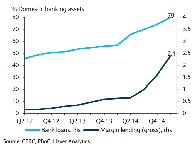 We also find few signs of contagion to the Chinese banking sector. Although margin financing provided by securities firms and the 'shadow financing' sector played a role in the equity run-up, the total financing provided seems to be around 6trn yuan. By contrast, the Chinese banking sector has over 100trn yuan in assets, with very little margin lending exposure; the bulk is bank loans.