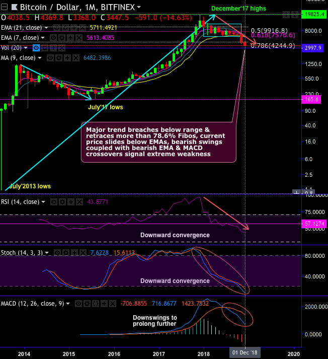 Bitcoin and its peers have again resumed their bearish streaks, sliding further after consolidating briefly above 7-DMAs. The price tumbles below $3,500 mark swiftly, as well as the yearly lows to generate new ones.