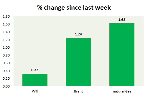 - Brent-WTI spread rose by 40 cents since last trading day, currently trading at $5.2/barrel.