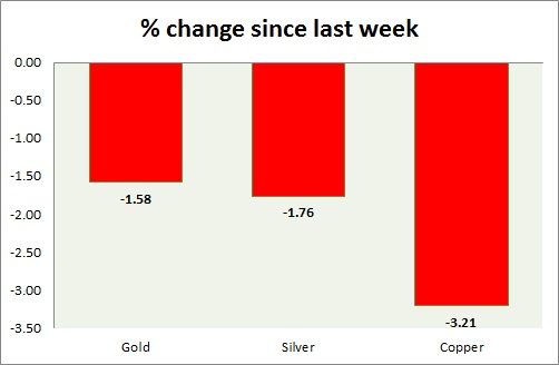 The metal pack is down today. Performance this week at a glance in chart & table -