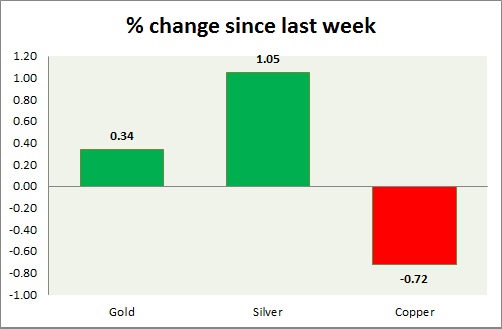 Metals failed to gain today, in spite of weaker dollar. Performance this week at a glance in chart & table -