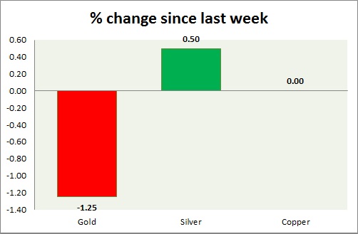 Metals pack is down today as dollar bounced back somewhat. Performance this week at a glance in chart & table -