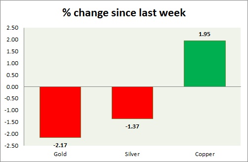 Metals pack is down today as dollar bounced back somewhat. Performance this week at a glance in chart & table -
