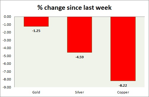 Metals are down sharply today. Performance this week at a glance in chart & table -