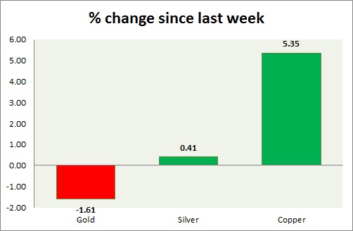 Metal pack is mixed as precious is trading in red, industrial is trading in green today. Performance this week at a glance in chart & table -