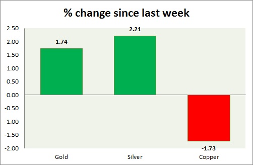 The metal pack is down today. Performance this week at a glance in chart & table -