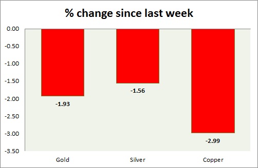 The metal pack is down today. Performance this week at a glance in chart & table -