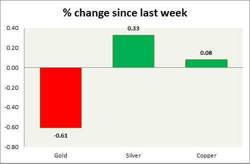 Metal pack is mixed, while precious is down, industrial is in green. Performance this week at a glance in chart & table -