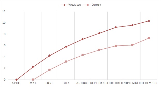 - Six months contango is down from $9.5/barrel to $6.1/ barrel. Minimum $6.5/barrel is required to store oil offshore and make a profit.